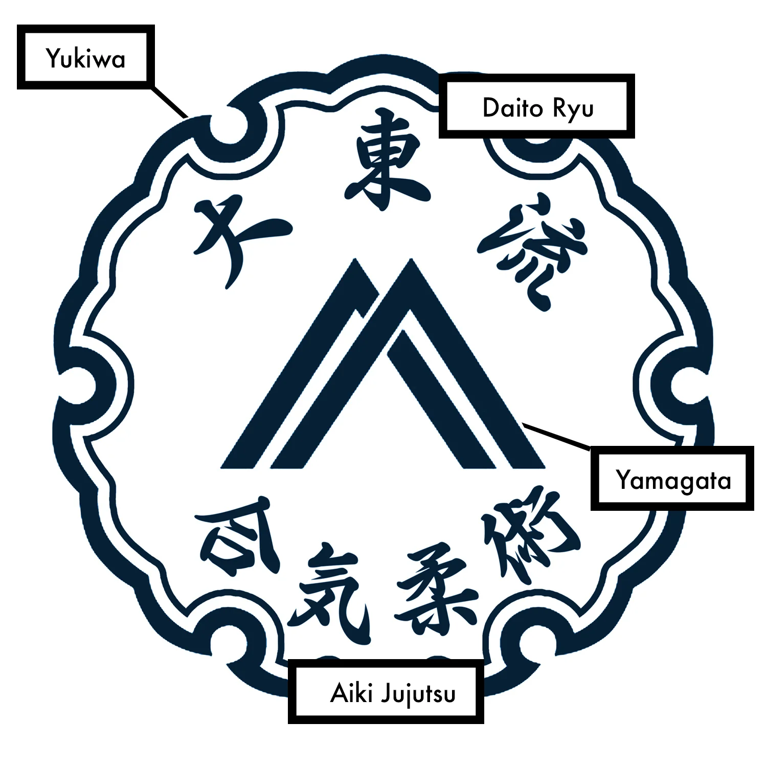 2. The central device is a “yamagata” or mountain shape, depicting two intersecting mountains. This symbolizes the inextricable link between Kiyama Shihan (wood mountain) and his student Goldberg Sensei (gold mountain). This connection is and always will be at the heart of the Daito Ryu we practice.
